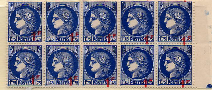 Bloc de 10 timbres du 1 F / 1F 75 avec surcharge déplacée.