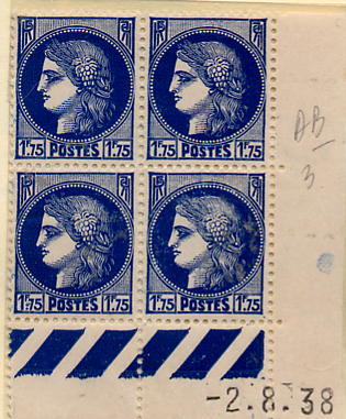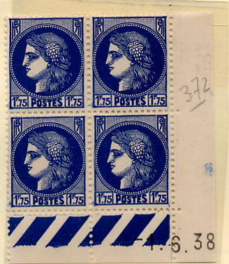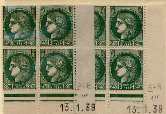 L'impression des différentes Cérès s'est faite sur imprimante rotative en feuilles de deux blocs de 50 timbres séparés par un interpanneau. Chaque planche est donc composée de 4 galvanos réunis 2 à 2 pour imprimer 2 feuilles de 100 timbres à chaque tour. Chaque feuille comporte un coin daté situé en bas à droite, sous la rangée de parallélogrammes ou de barres ( à partir du 25 avril 1938 ) colorées. Il y a donc 2 coins datés par planche.