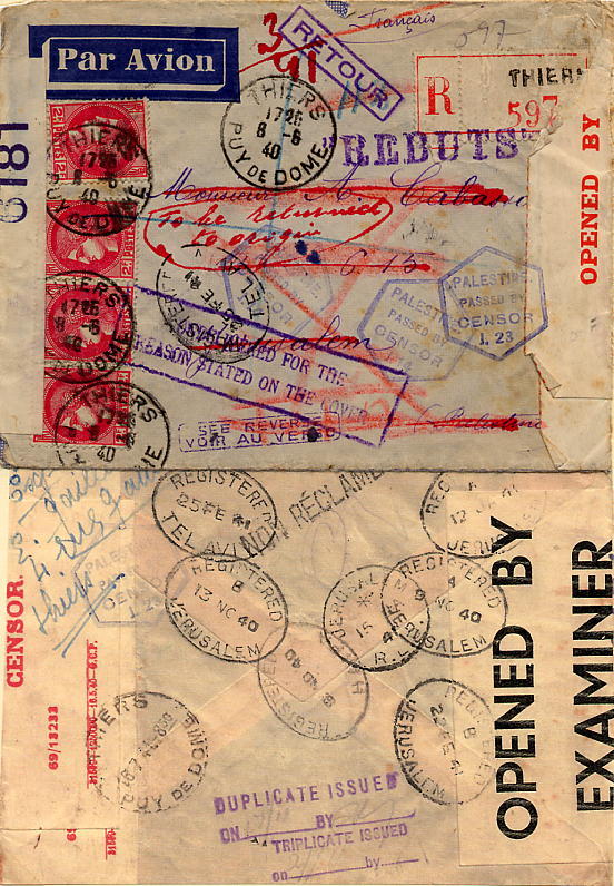 Bel affranchissement multiple pour cette lettre à destination de Jérusalem ( LSE : 5 F + surtaxe aérienne 3 F ) La lettre recommandée a été expédiée le 8 juin 1940 avant que les lignes postales soient interrompues. Après avoir été examinée par la censure anglaise, elle n'a pas trouvé son destinataire et, après de nombreux essais a été renvoyée à l'expéditeur ( cachet de Thiers du 17.07.41 ). Non réclamée, la lettre a été mise aux rebuts. |