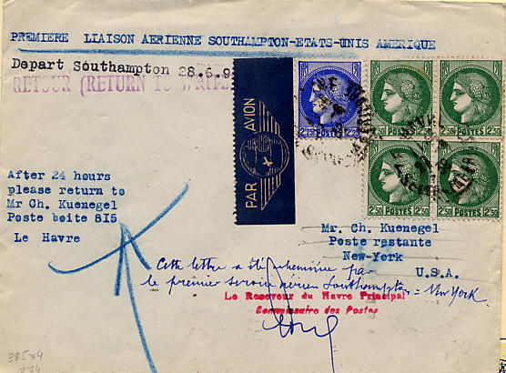 Pièce philatélique commémorant l'ouverture de la ligne aérienne Southampton à Etats Unis. Tarif : 2,25 F ( LSE ) + 10 F de surtaxe aérienne ( tarif du 13.05.39 ).