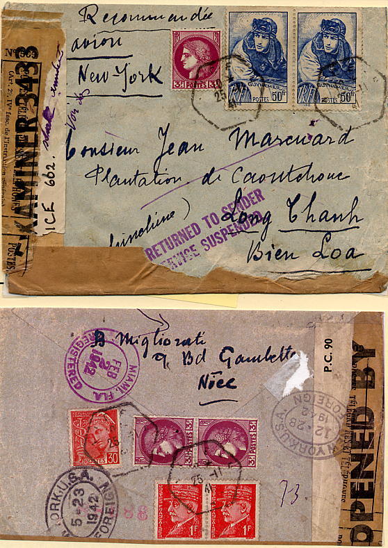Même si les timbres Cérès n'ont ici qu'un rôle de valeurs complémentaires voilà un pli qui n'a pas eu de chance ... ce qui en fait un document probablement unique : Ce pli devait peser entre 90 et 100 gr. Il a été expédié de Nice vers l'Indochine en novembre 1941. Comme la ligne orientale normale était fermée l'expéditeur a du se résoudre à passer par la voie d'Amérique, via vraisemblablement l'Espagne et Lisbonne, avec les conséquences financières induites ( surtaxe aérienne de 12 F / 10 g soit 108 F de surtaxe ). On a donc un affranchissement de 3,30 F ( lettre recommandée tarif intérieur ) + 108 F = 111,30 F. Mais lorsque la lettre arrive aux Etats Unis, où elle est contrôlée, les Japonais attaquent Pearl Harbor. La lettre est coincée en Amérique. Elle y divague pendant l'année 1942 ( plusieurs cachets) avant qu'il soit décidé de la renvoyer à l'expéditeur. |