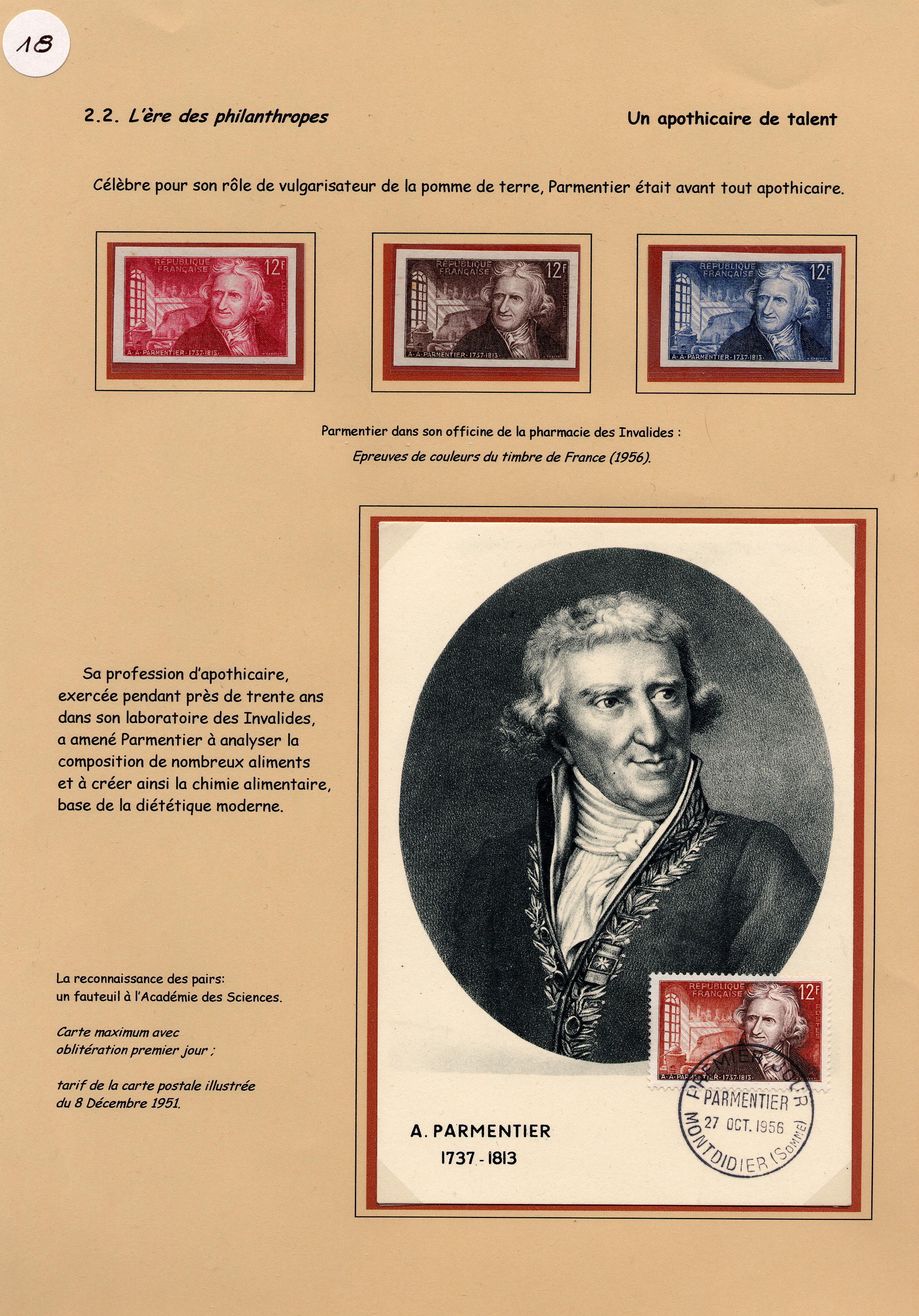 Utilisation de plusieurs essais de couleur du timbre émis en l'honneur de A. Parmentier. Présentation rehaussée par l'utilisation d'une carte 1° jour avec le timbre définitif. |