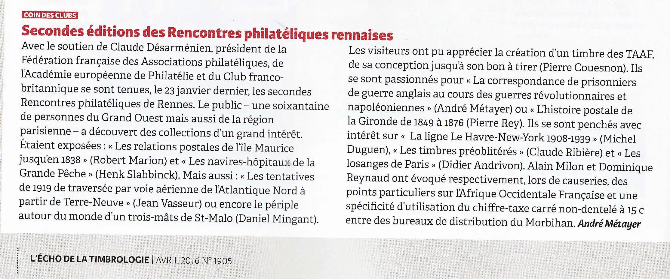 La seconde édition des Rencontres Philatéliques Rennaises nous a transportés aux quatre coins de la planète philatélique. C'est par un exposé de notre invité d'honneur Monsieur Robert Marion, Président de La société philatélique Franco-Britannique et représentant de la Royal Society en France, spécialiste de la philatélie de l'Ile Maurice, qu'elle a débuté: il a parfaitement mis en valeur les richesses de la pré-philatélie mauricienne, mas aussi les liens étroits qui unissent l'histoire de cette île à celles des grands ports et marins bretons, en particulier ceux de Saint Malo et de Lorient.